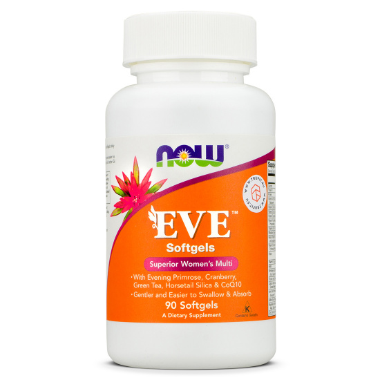Eve Women's Multi contains evening primrose, cranberry, green tea, horsetail silica, CoQ10, and more active ingredients directed to maintain women’s general health, energy metabolism and nervous system functions, support skin, hair, nails, and joint health.